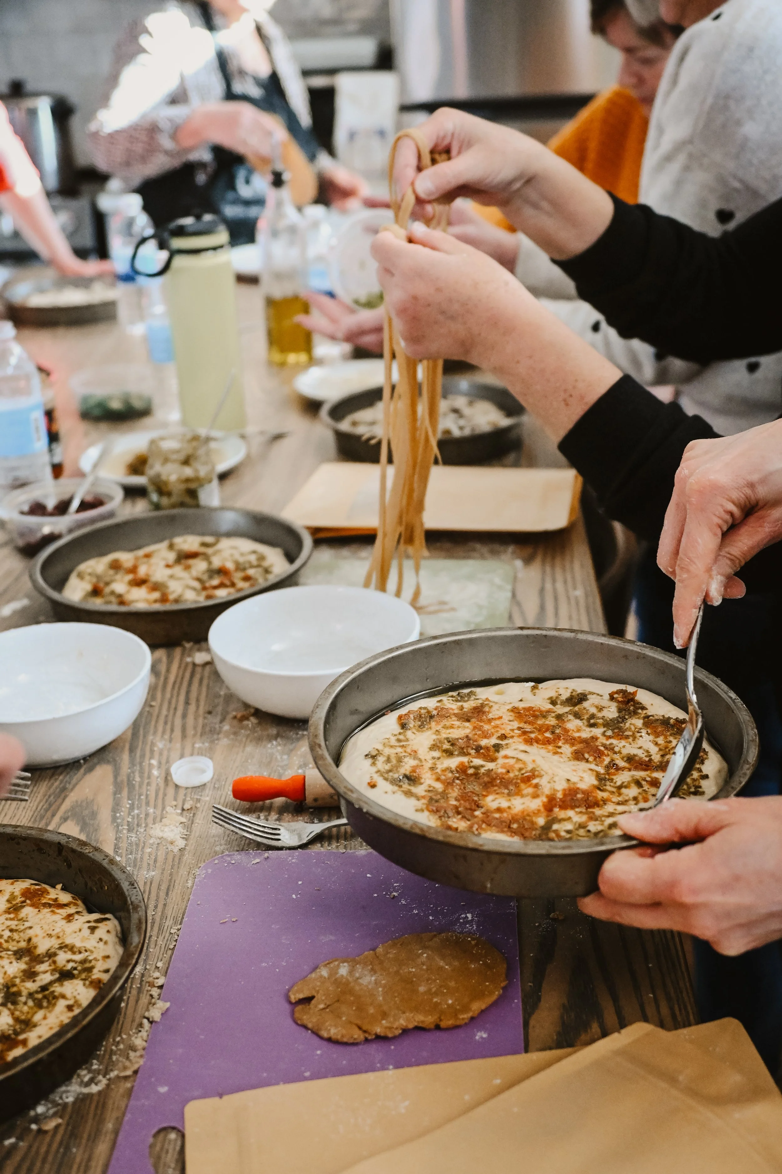 Learn how to make focaccia, pasta from scratch, take your own home and then enjoy a full meal with your friends made by us!